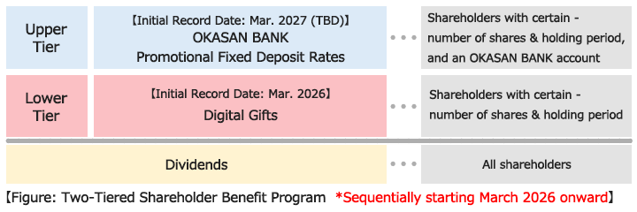 The shareholder benefit program features a two-tiered structure: the lower tier offers digital gifts and the upper tier offers yen-based promotional fixed deposit rates through "OKASAN BANK" banking service.