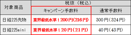キャンペーン期間中、アクティブ先物取引で約定した日経225先物、日経225miniの手数料を以下の通りとします。