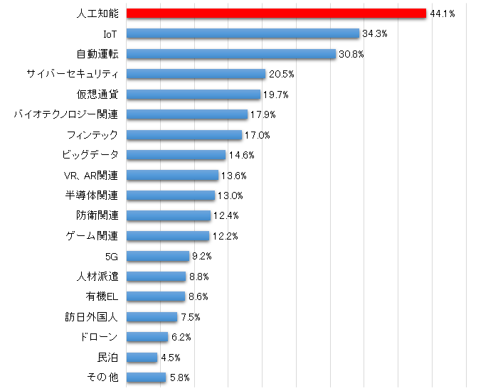 下期の注目テーマとしては、「人工知能」を挙げる方が44.1%で最も多く、次いで「IoT」(34.3%)、「自動運転」(30.8%)という結果となりました。全般的に科学技術、フィンテックなど技術革新に対する期待が高いことが伺えます。また、3年後の東京五輪に向けて「訪日外国人」、「民泊」などを挙げる回答も散見されました。