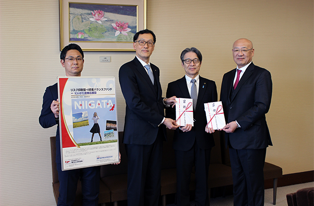 岡三にいがた証券株式会社は、本日、委託会社のSBI岡三アセットマネジメント株式会社とともに、投資信託「リスク抑制型・4資産バランスファンド」愛称「にいがた創業応援団」の信託報酬の一部から、新潟県の起業・創業支援として新潟県に寄付をいたしましたので、下記のとおりお知らせいたします。